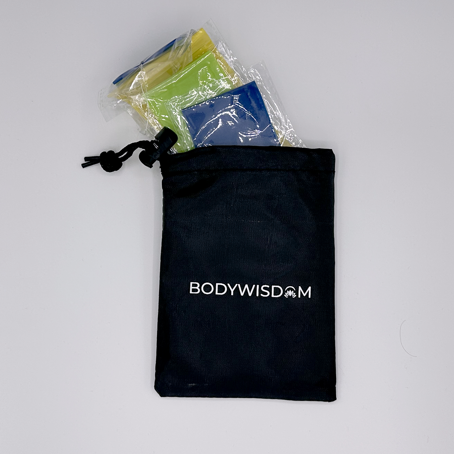 Exercise resistance bands with three different levels. 2-4 pounds, 6-8 pounds, 10-12 pounds, all in a convienent drawstring bag to bring them whereever you go!!